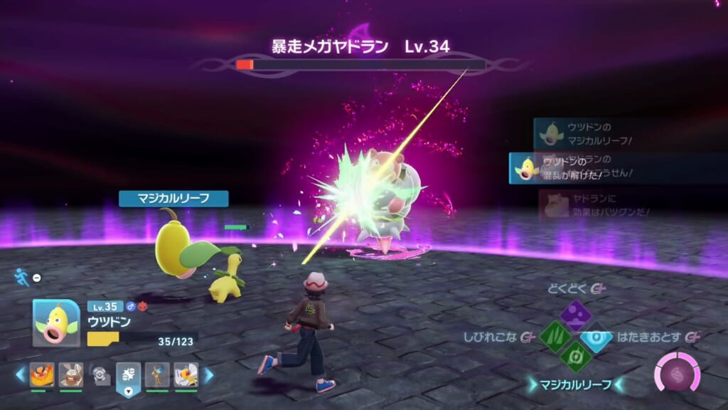 連続で被弾してしまうと一気にHPが削れてしまい、混乱になる可能性も上がってしまうので、ポケモンを手元に戻して横移動して回避します。