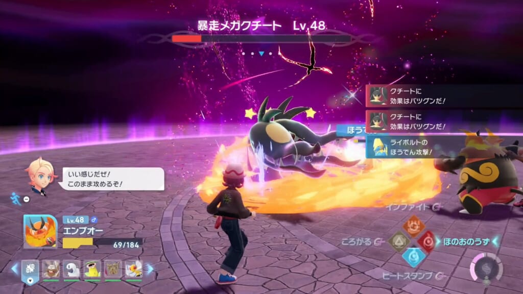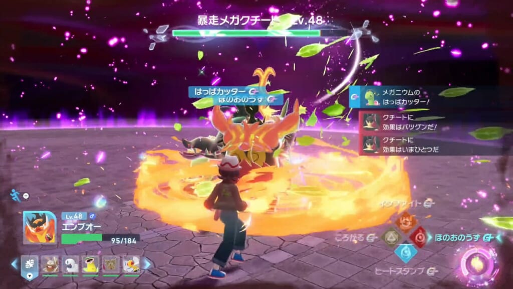 非常に避けづらい攻撃なので、画面右側の「じゃれつく」の通知が見えて メガクチートから視界から消えたタイミングでローリングして回避しましょう。