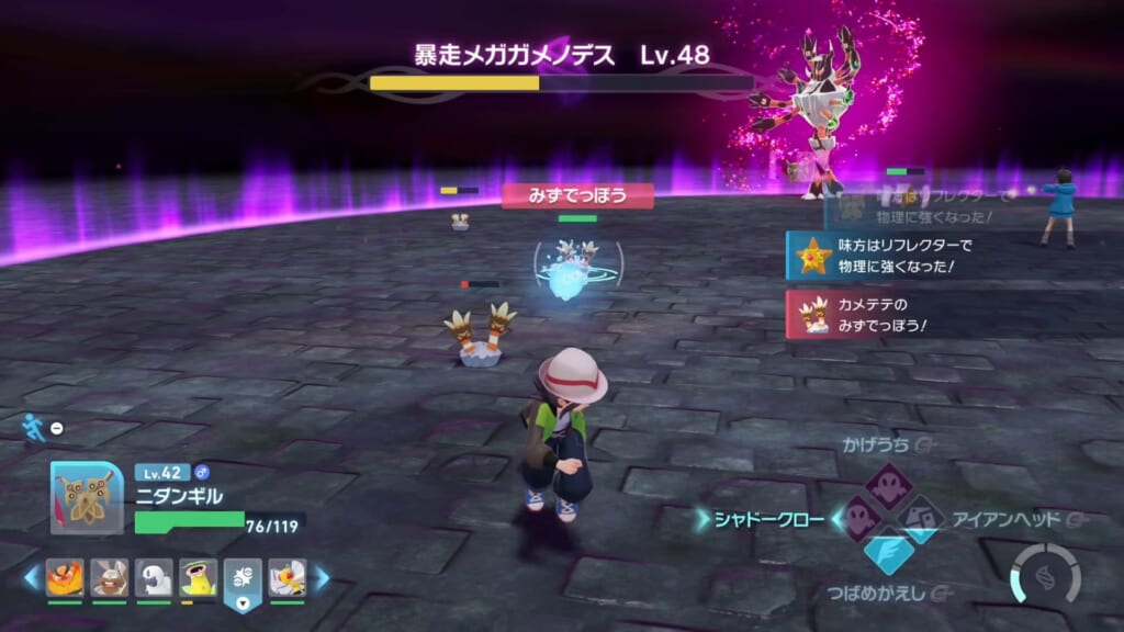 カメテテは きりさく や じならし 、 みずでっぽう による攻撃でメガガメノデスを援護します。