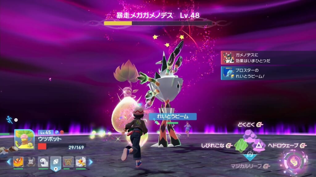 また、エネルギーを溜めているときにメガシンカポケモンやワザプラスでダメージを蓄積することで溜めが止まり、特殊行動がパンチ連打だけと大幅に弱体化されます。