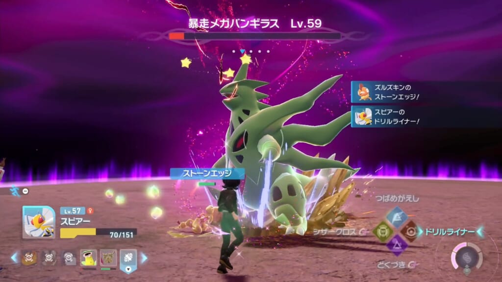 直前までバンギラスに与えたダメージを引き継いだ状態で再びバトルに挑戦できるので、どうしても勝てない場合はHPひきつぎ機能を使いましょう。