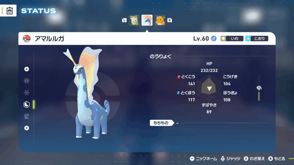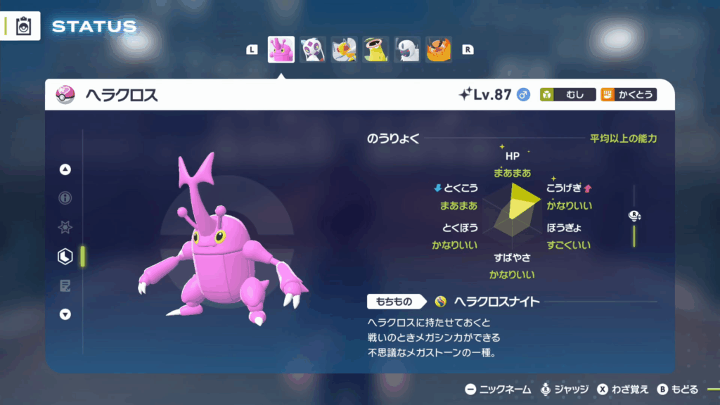 クリア後に解放される「ジャッジ機能」を使うことで、そのポケモンに割り振った努力値を大まかに確認することができます。