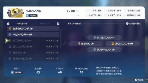 メルメタルを受け取った直後、ポケモンの「つよさをみる」画面で 加入したメルメタルの個体値を確認します。