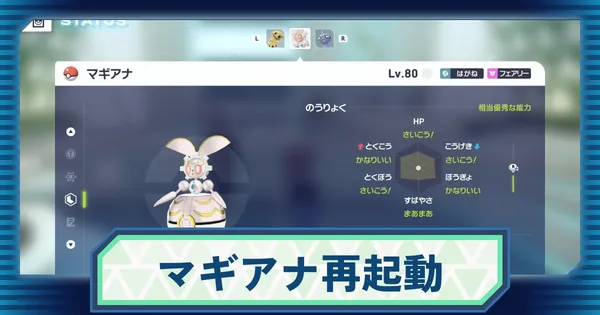 サイドミッション終了後、ポケモンの「つよさをみる」画面で 加入したマギアナの個体値を確認します。