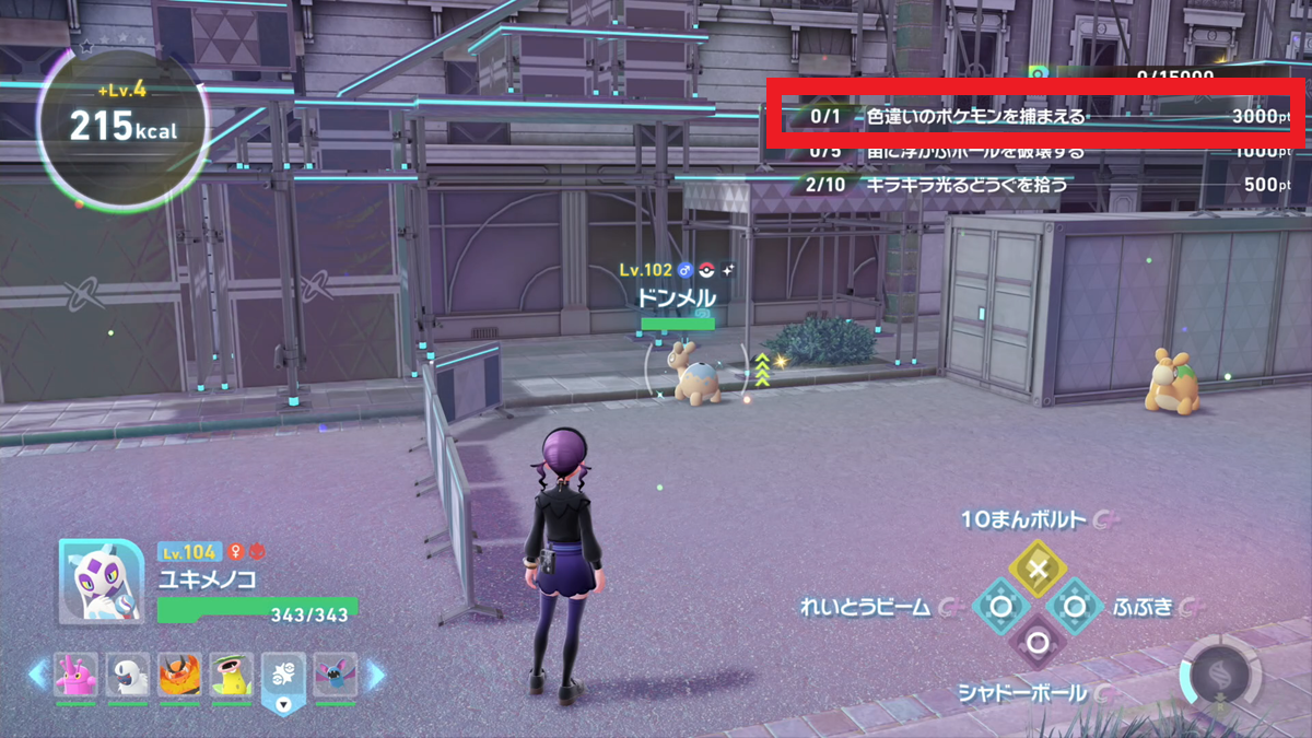 色違い捕獲ミッションが発生した場合は、異次元ミアレのフィールド内に必ず色違いのポケモンが出現するので、くまなく探して捕獲しましょう。