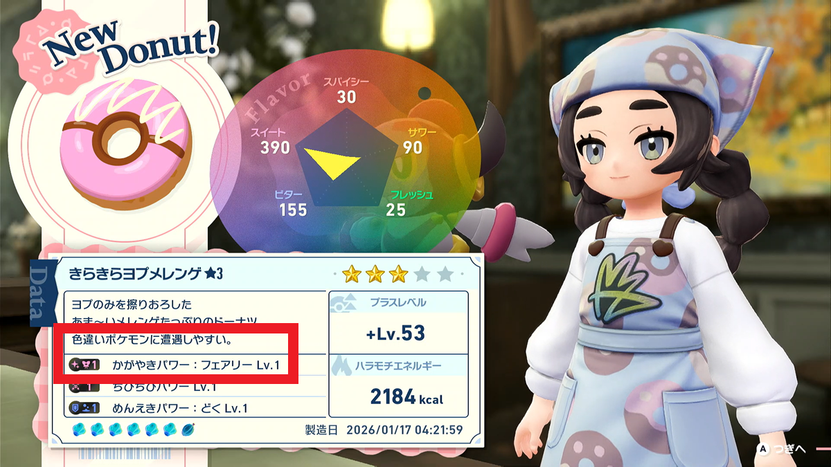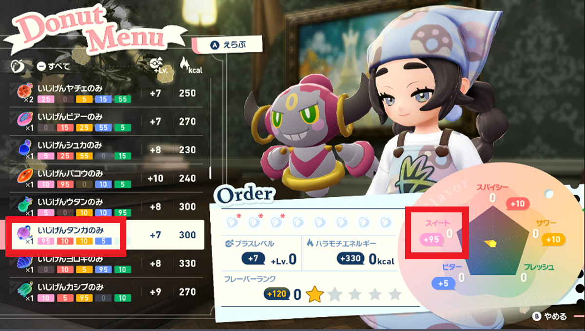 ドーナツ作成に使う「きのみ」によって異次元ミアレでの滞在時間や追加効果(フレーバーパワー)などが変化します。