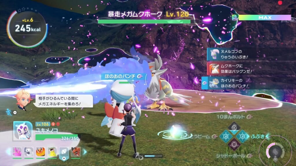 直前までメガムクホークに与えたダメージを引き継いだ状態で再びバトルに挑戦できるので、どうしても勝てない場合はHPひきつぎ機能を使いましょう。