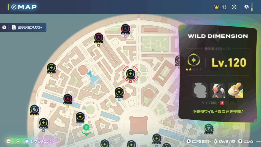 異次元ミアレでは、マップを開くとカーソルの初期位置に入口のボタンが置かれています。