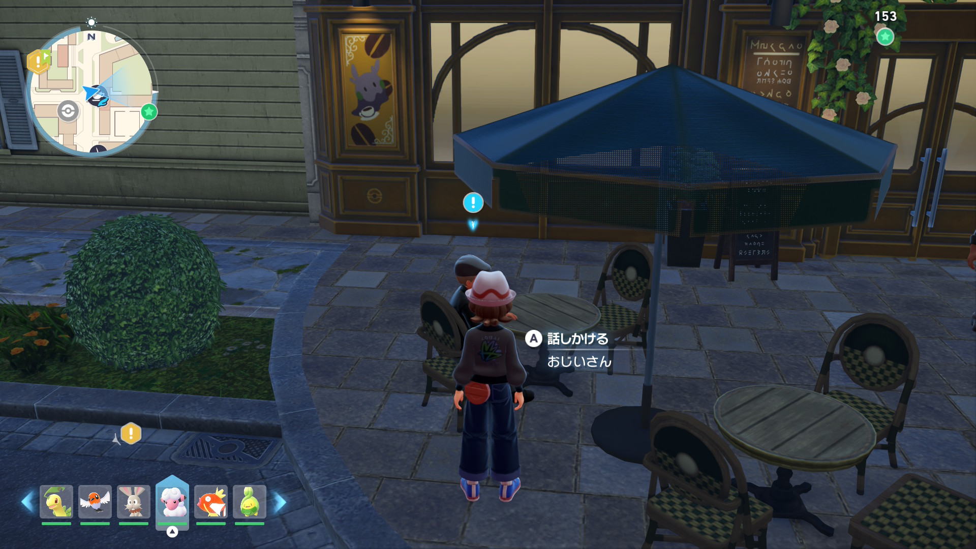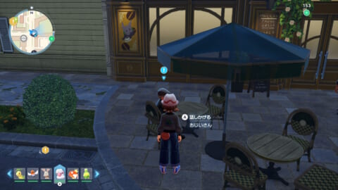 カフェ・アラモード前の椅子に座ってるおじいさんに話しかけて、フォッコを元気にできるという「げんきのこえだ」について聞きます。