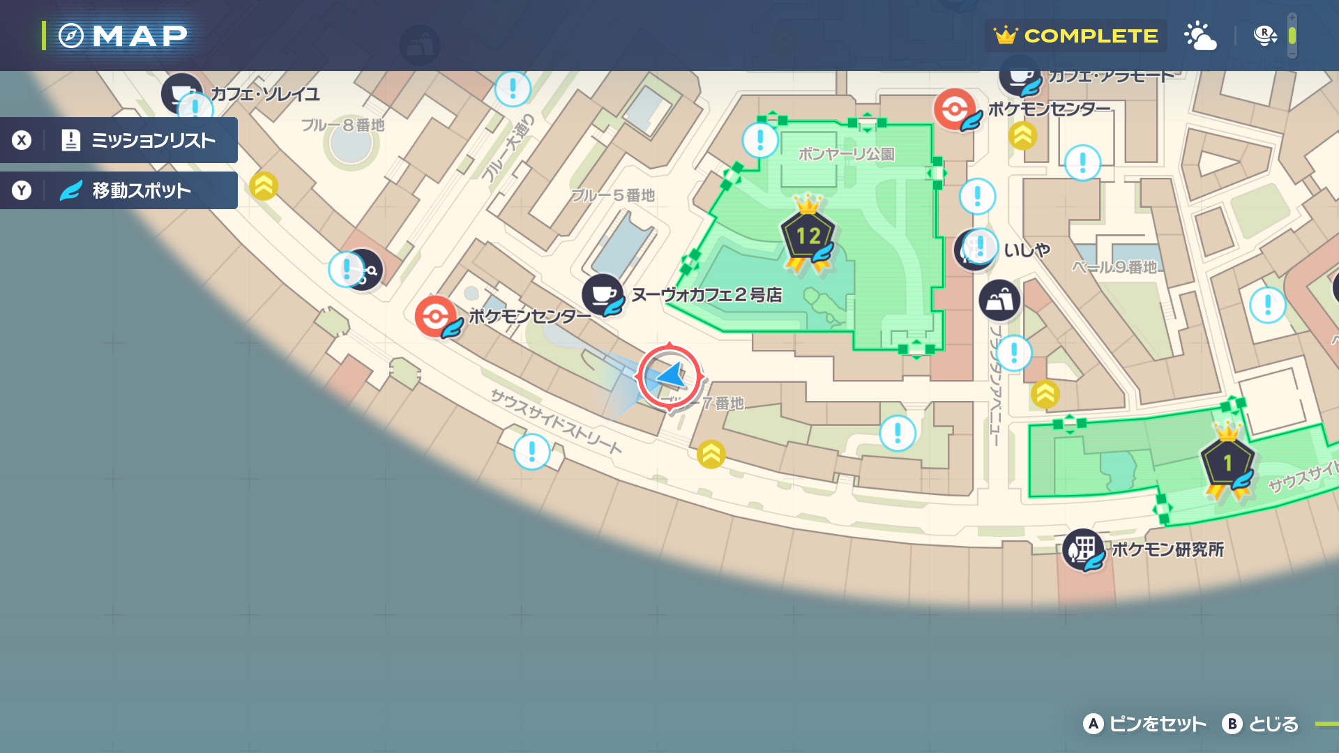 そらをとぶポイント「ポケモンセンター:ブランタン」から南へ進み、1つめを左に曲がりバトルコートを越えた先すぐ右にある小さな庭(※マップ画像右)に入ります。
