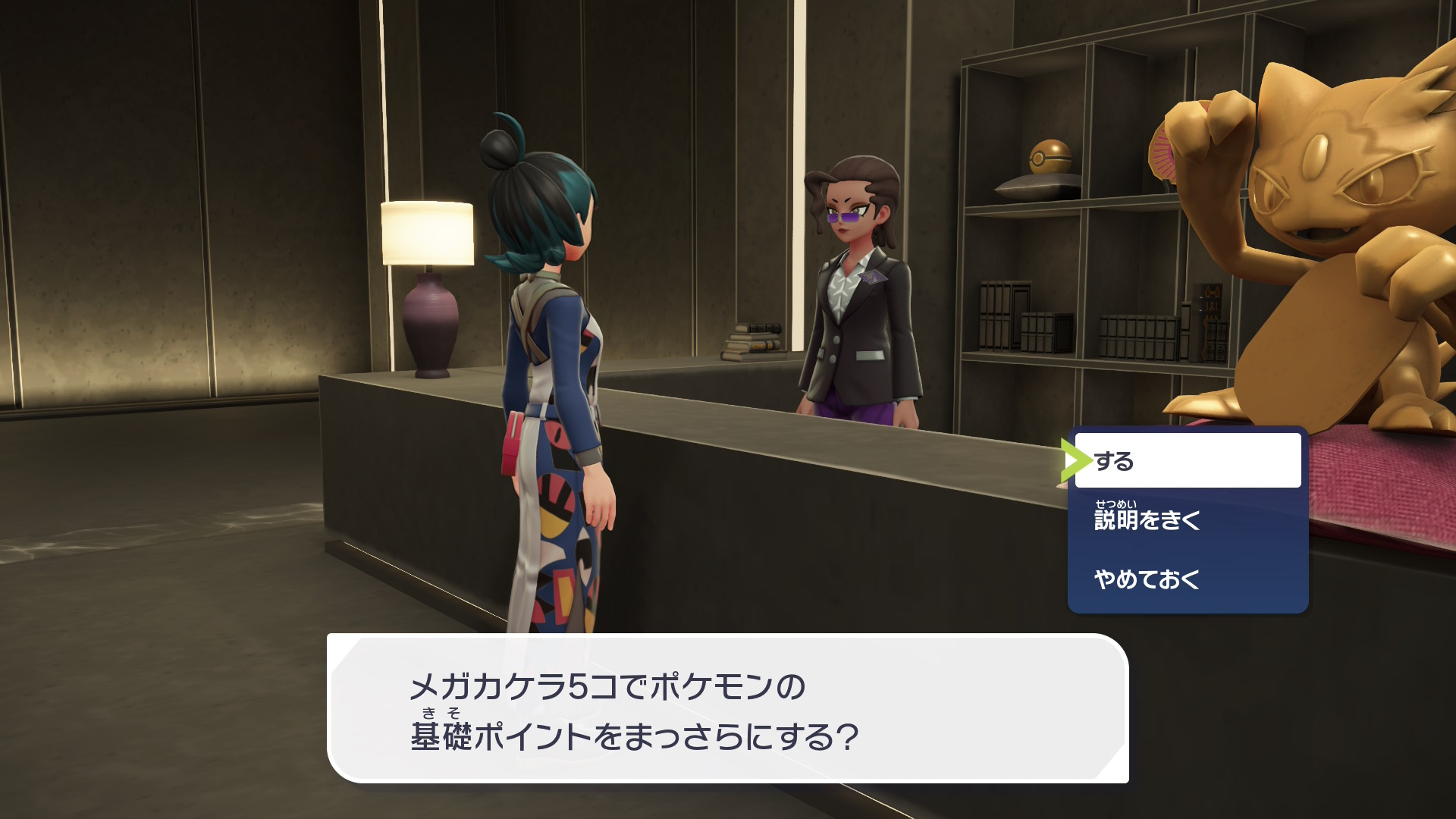 サビ組の事務所に入って、向かって右側にいる女性に話しかけると、メガカケラ5個と交換でポケモンの基礎ポイント(努力値)を0にすることができます。