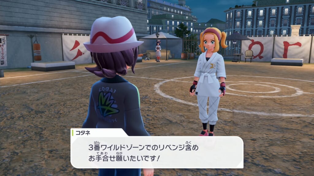 ジャスティスの会道場へ向かい、コタネに話しかけて「わかりました」を選択するとバトルが始まります。