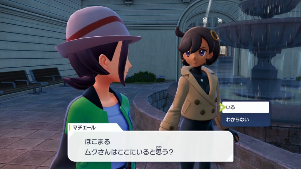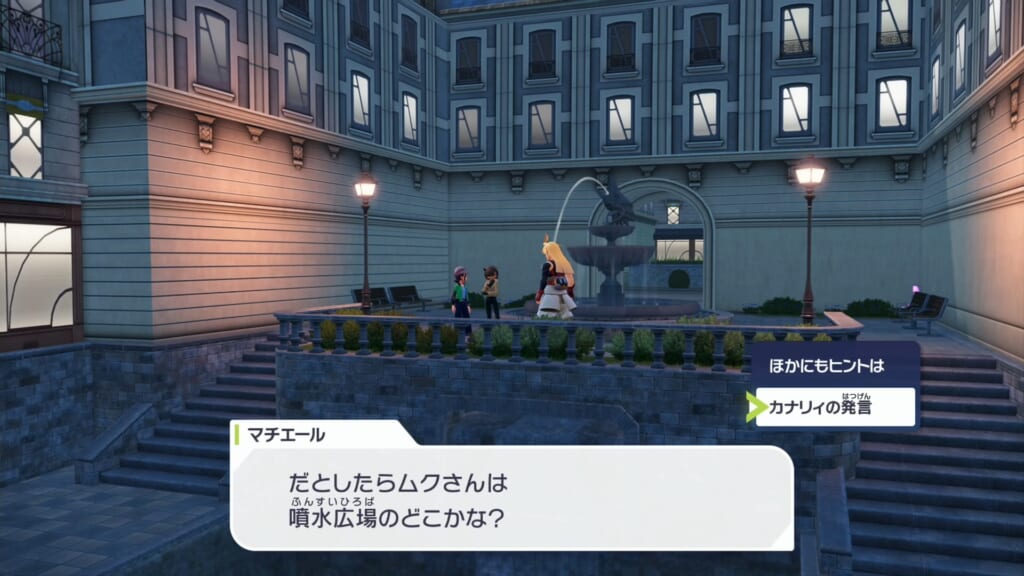 市役所の東側にある噴水脇の男性いる「ムク…といえば」とセリフが出ている男性に話しかけると情報が得られます。