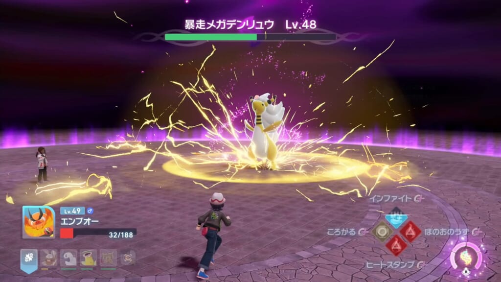 メガデンリュウ本体から距離を取りつつ地面に設置される雷ゾーンと地面を走る雷に気を配りながら戦いましょう。