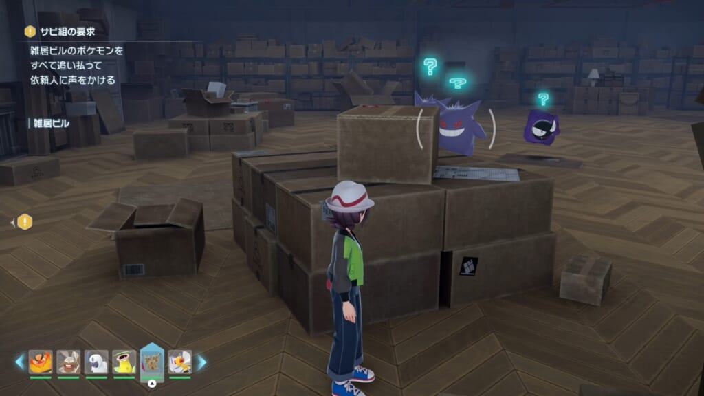 建物入り口にいるサビ組員に話しかけ、雑居ビル内に入り ゲンガー×2、ゴースを倒すか捕まえて追い払います。