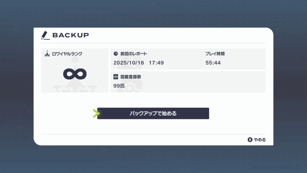 Z-Aを再度起動し、十字キーの上+Bボタン+Xボタンを同時押しして「バックアップから始める」を選択します。