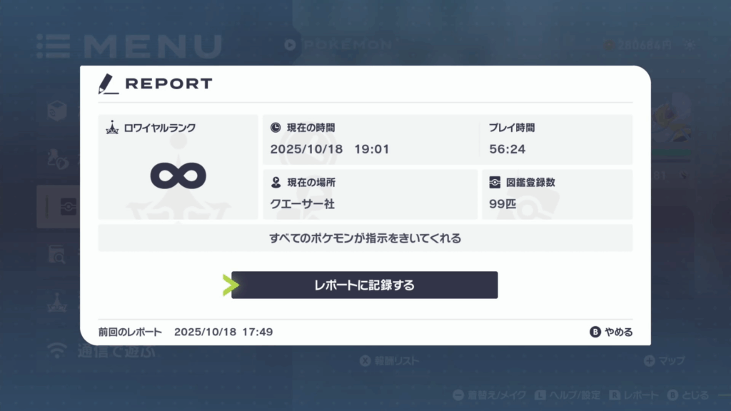 Xボタンでメニューを開き、Rボタンを押し「レポートに記録する」を選択します。
