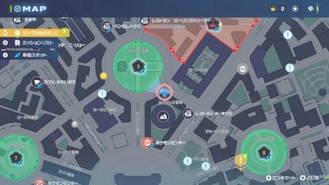 どくどくは、ルージュ2番地にある大き目のアスレチックを昇った先のビルの上(※以下画像の位置)に落ちており、「ポケモンセンター:メディオ」から目指すのがおすすめです。