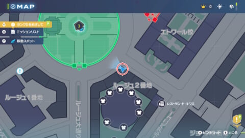 アスレチックは、「ポケモンセンター:メディオ」から「ギャルリ・クレーヌドリュヌ」の外側を壁沿いに歩いた、ポケモンセンターから正反対の位置にあります。