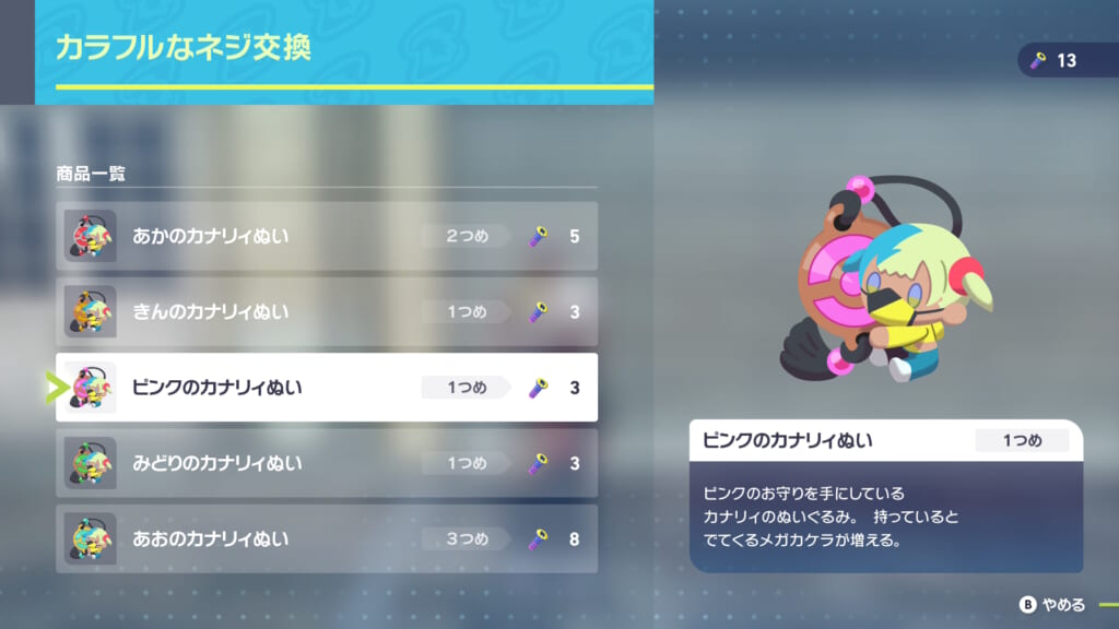 ミアレシティ中に落ちている カラフルなネジ を集め、「ラシーヌ工務店」に持ち込むことでカナリィぬいと交換できます。