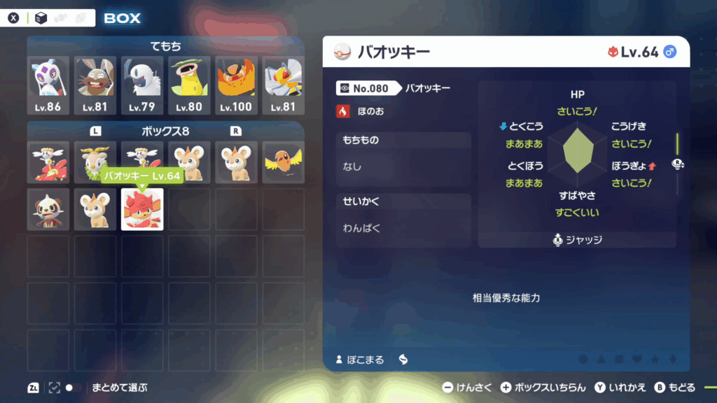 能力を確認したいポケモンにカーソルを合わせるか、ポケモンのステータス画面で右スティックを押し込むことで 各ステータスごとの個体値を確認できます。