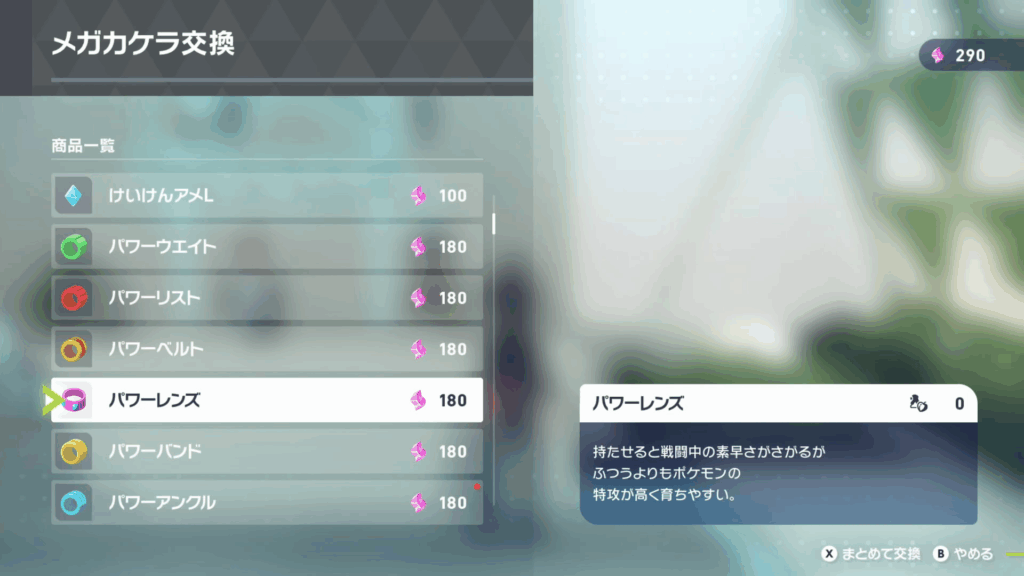 育成したいポケモンに パワー◯◯をもたせた状態で野生ポケモンを倒すと努力値を大量に獲得可能なので、オンライン対戦のランクバトル向けにポケモンを育成するために購入しておきましょう。