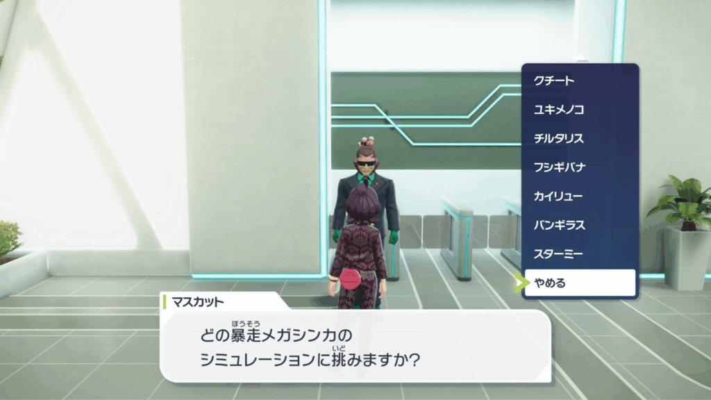 クエーサー社の奥にいるマスカットと話すことで、「暴走メガシンカシミュレーター」が利用できます。