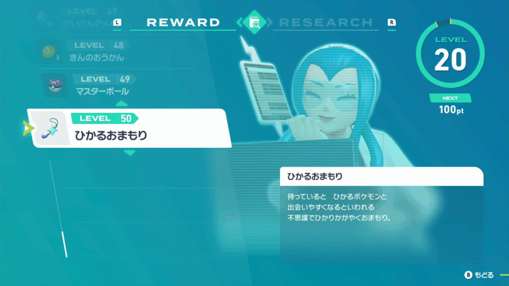 また、研究レベル49では 必ずポケモンを捕獲できる「 マスターボール 」、研究レベル50では色違いポケモンとの遭遇率が約4倍になる「 ひかるおまもり 」が入手できます。