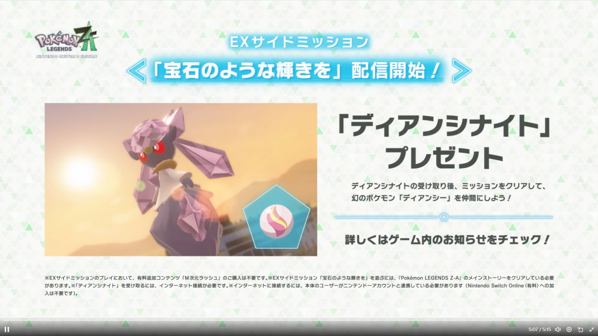 2025年11月6日より、 ディアンシー を捕獲できる特別なEXサイドミッション「宝石のような輝きを」が「ふしぎなおくりもの」で受け取れるようになりました。