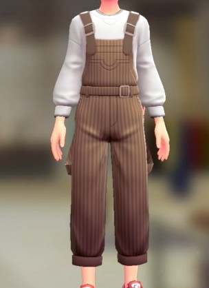 「ポケモン レジェンズ Z-A」における服装(着せ替え)「サロペット&スウェットセット - ストライプキャメル ホワイト」の画像や販売場所・ブランドなどを紹介しています。