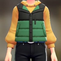 「ポケモン レジェンズ Z-A」における服装(着せ替え)「ダウンベスト&パーカーセット - バイカラーグリーン イエロー」の画像や販売場所・ブランドなどを紹介しています。