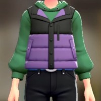 「ポケモン レジェンズ Z-A」における服装(着せ替え)「ダウンベスト&パーカーセット - バイカラーパープル グリーン」の画像や販売場所・ブランドなどを紹介しています。