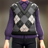 「ポケモン レジェンズ Z-A」における服装(着せ替え)「ニットベスト&ブラウスセット - アーガイルブラック パープル」の画像や販売場所・ブランドなどを紹介しています。
