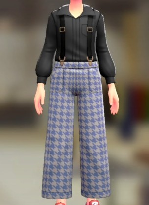 「ポケモン レジェンズ Z-A」における服装(着せ替え)「サスペンダーパンツセット - ちどりがらブルー ランプブラック」の画像や販売場所・ブランドなどを紹介しています。
