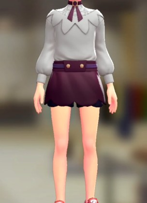 「ポケモン レジェンズ Z-A」における服装(着せ替え)「ブラウス&キュロットセット - ムーングレー バーガンディ」の画像や販売場所・ブランドなどを紹介しています。