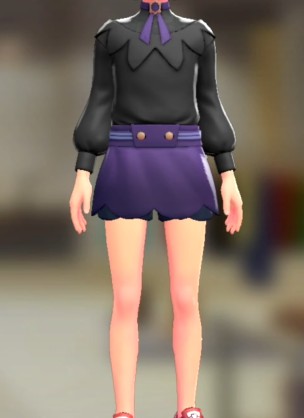 「ポケモン レジェンズ Z-A」における服装(着せ替え)「ブラウス&キュロットセット - ランプブラック バイオレット」の画像や販売場所・ブランドなどを紹介しています。