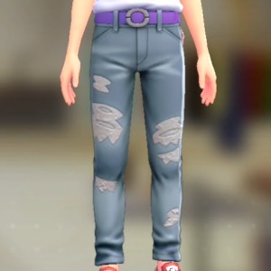 「ポケモン レジェンズ Z-A」における服装(着せ替え)「スキニーパンツセット - ダメージブルー ビビッドパープル」の画像や販売場所・ブランドなどを紹介しています。