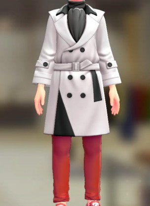 「ポケモン レジェンズ Z-A」における服装(着せ替え)「トレンチコート&パンツセット - ビビッドホワイト グレー×レッド」の画像や販売場所・ブランドなどを紹介しています。