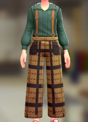「ポケモン レジェンズ Z-A」における服装(着せ替え)「サスペンダーパンツセット - ブレイブリーキャメル グリーン」の画像や販売場所・ブランドなどを紹介しています。