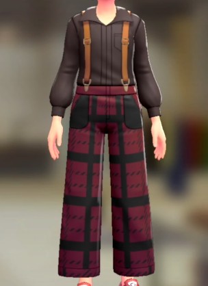 「ポケモン レジェンズ Z-A」における服装(着せ替え)「サスペンダーパンツセット - ブレイブリーレッド ダークブラウン」の画像や販売場所・ブランドなどを紹介しています。