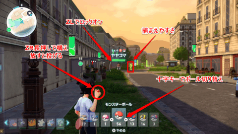 - ボールを投げる: ZLボタンでロックオンした状態で、ZRボタンを長押しして狙いを定め、離すとボールを投げます。