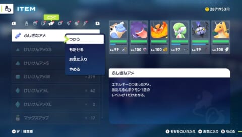 ふしぎなアメは、メニューにある「ポーチ」の「どうぐ」の欄からアイテムを選び、「つかう」でレベルアップしたいポケモンを選択すると使用できます。