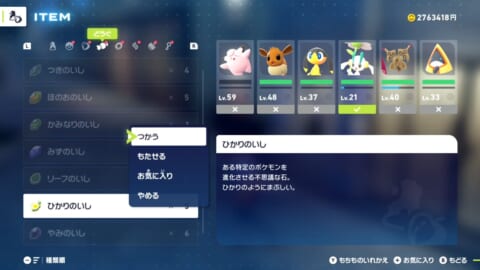 ひかりのいしは、特定のポケモンを進化させる際にポーチの「どうぐ」からアイテムを選び、「つかう」を選択して使用します。