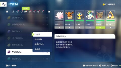 やみのいしは、特定のポケモンを進化させる際にポーチの「どうぐ」からアイテムを選び、「つかう」を選択して使用します。