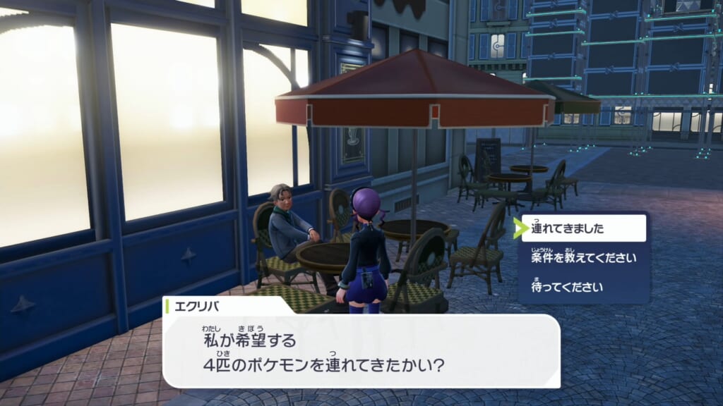 エクリバに指定された条件に合致したポケモンを4匹手持ちに入れます。