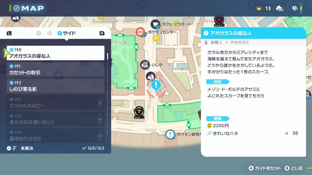 『ポケモン レジェンズ Z-A』に登場するサイドミッション「アオガラスの尋ね人」の攻略情報を以下で解説しています。