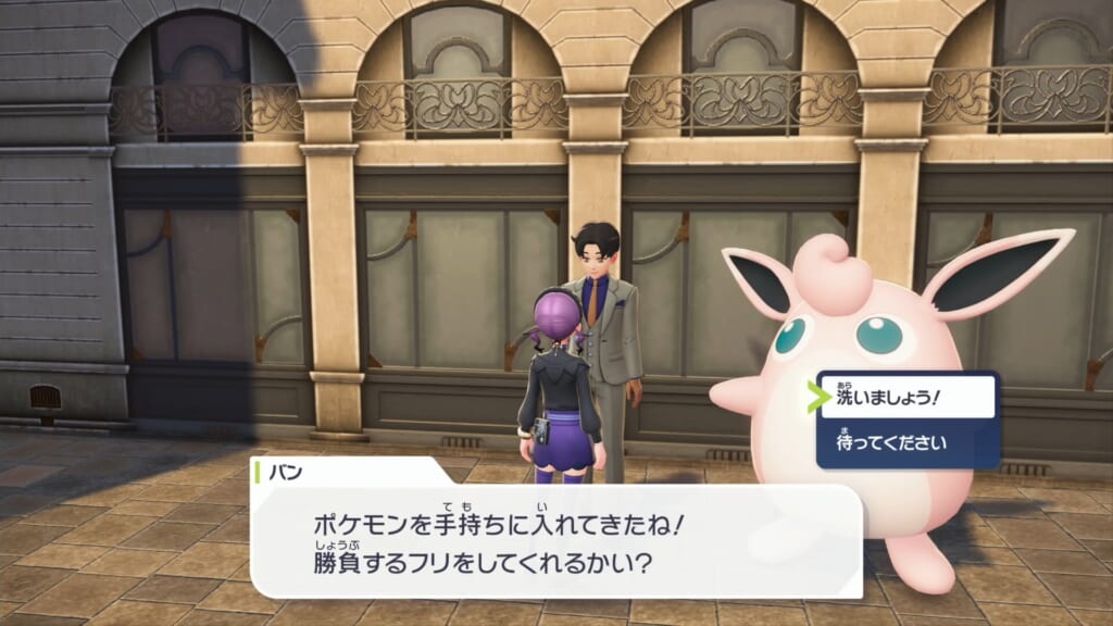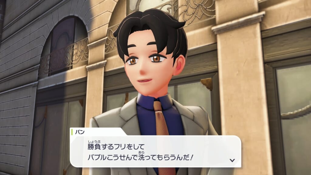 バブルこうせんを覚えたポケモンを手持ちに入れてバンに再度話しかけ、「洗いましょう!」を選択するとバトルになります。