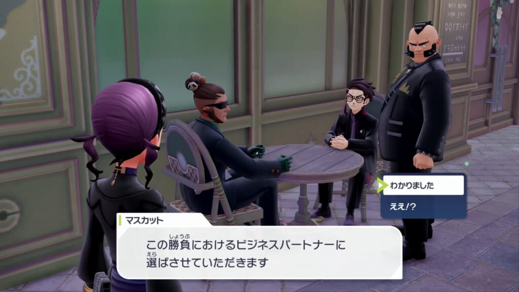 カラスバ・ジプソ・マスカットの会話イベントが進行し、マスカットが出す選択肢に「わかりました」を選択するとバトルになります。