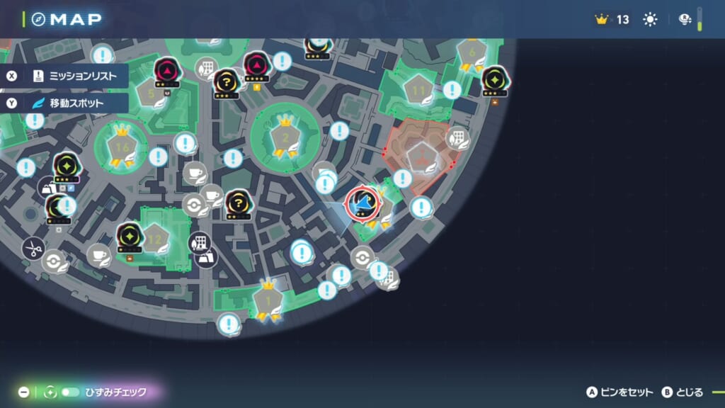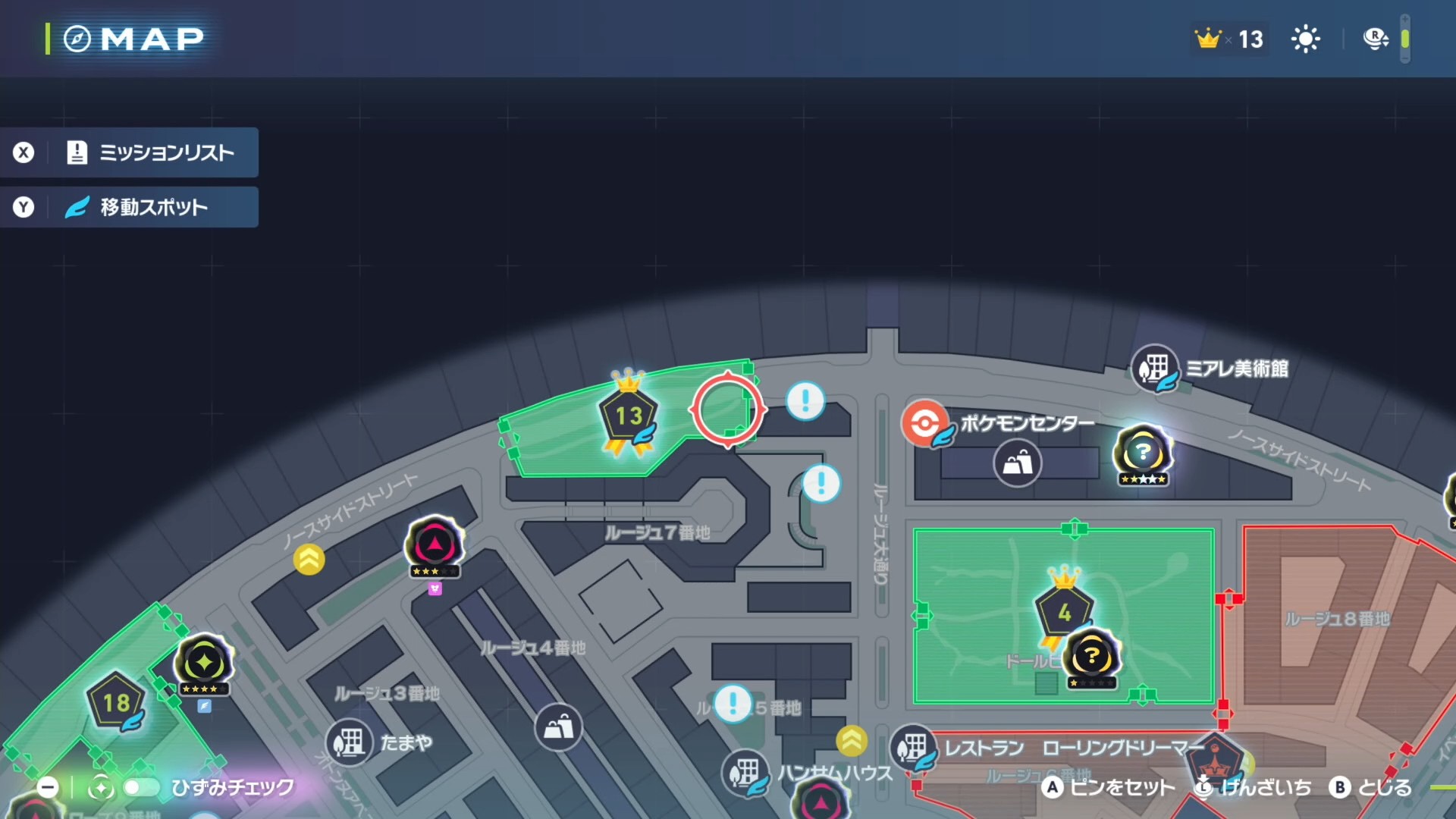 マップ北側のポケモンセンター:ルージュを最後に使用しておくと、リセット後にスムーズにワイルドゾーン13番に移動できます。