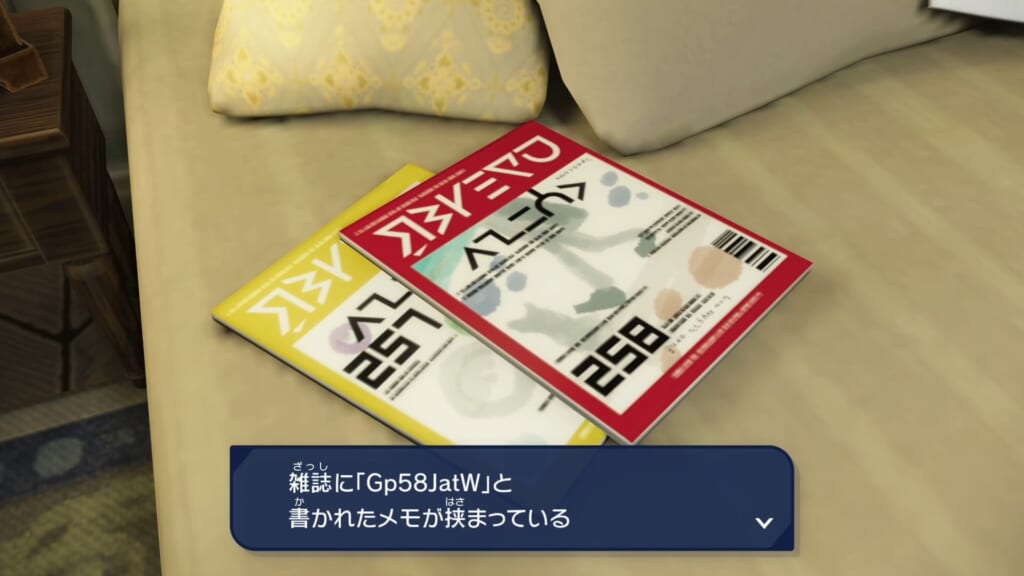 201号室に入り、ベッドの上にある雑誌に挟まったメモに記されているパスワードを調べます。